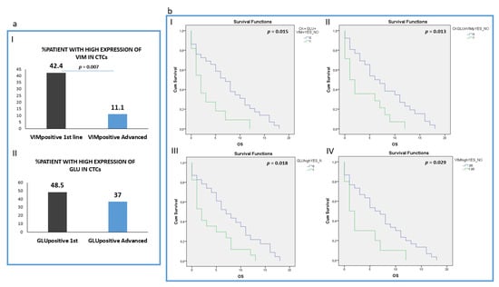Clinical outcome in NSCLC patients. (a) (I) Percentage of treatment naïve (1st line) versus pre-treated (advanced) patients with high VIM expression in their CTCs; (II) Percentage of treatment naïve (1st line) versus pre-treated (advanced) patients with high GLU expression in their CTCs; (b) (I) Overall survival (OS) in patients harboring the (CK+GLU+VIM+) phenotype in their CTCs; (II) Overall survival (OS) in patients harboring the (CK+GLU-VIM+) phenotype in their CTCs; (III) Overall survival (OS) in patients harboring High expression of GLU in their CTCs; (IV) Overall survival (OS) in patients harboring High expression of VIM in their CTCs.