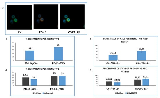 Expression of Cytokeratin (CK) and PD-L1 in patients’ samples. (a) CK (green) and PD-L1 (red) staining in patients’ samples; (b) Percentage of patients with PD-L1-positive and PD-L1 negative CTCs; (c) Percentage of CTCs-expressing PD-L1 among the total isolated tumor cells; (d) Percentage of patients expressing PD-L1 among the treatment naïve (1st line) versus pre-treated (advanced) patients; (e) Percentage of CTCs-expressing PD-L1 in treatment naïve (1st line) versus pre-treated (advanced) patients.