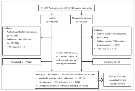 Among 514,866 participants, 56,333 were included in the osteoporotic fracture group according to the definition of each fracture in our study, and 458,533 were included in the control group. Because the PA information was different from 2002 to 2008, those participants and participants without PA records were removed (n = 33,337 in the osteoporotic fractures group; n = 57,788 in the control group). In the osteoporotic fractures group, participants who did not undergo the BMD test before the first fracture diagnosis (index date) were excluded (n = 10,875; claim codes were described elsewhere [17]). In the control group, participants who did not undergo the BMD test from 2002 to 2015 were excluded (n = 277,717). The matching method that was previously used in our studies was conducted [17,20]. The total fracture group and control group were matched in 1:2 ratios by age, sex, income, and region of residence. Each control participant was assigned the same index date as each matched fracture participant. Control participants who did not have a BMD test before the index date were excluded from matching. During the matching process, 98,822 control participants were excluded. Finally, 12,103 osteoporotic fracture patients and 24,206 control patients were included in the analysis. Furthermore, the fractures and matched controls were classified into specific sites of fracture as follows: 6858 in the vertebral fracture group and 13,716 in the control I group; 1096 in the hip fracture group and 2192 in the control II group; 4149 in the distal radius fracture group and 8298 in the control III group. Each fracture group and matched control group were analyzed for previous PA and SD (Figure 1).