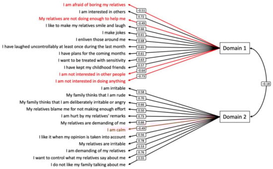 Path diagram of the final exploratory factor analysis. Black and red one-headed arrows represent positive and negative standardized loadings, respectively. The two-headed arrow represents correlation. Domain 1 reflects social motivation and Domain 2 reflects emotional insight.