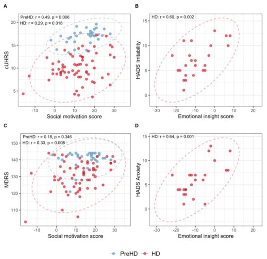 Relationships between SRSQ domains and clinical assessments: (A) social motivation and cUHDRS; (B) emotional insight and HADS Irritability; (C) social motivation and MDRS; (D) emotional insight and HADS Anxiety. Abbreviations: PreHD = presymptomatic stage, HD = Huntington’s Disease, cUHDRS = Composite Unified Huntington’s Disease Rating Scale, HADS = Hospital Anxiety and Depression Scale, MDRS = Mattis Dementia-Rating Scale.