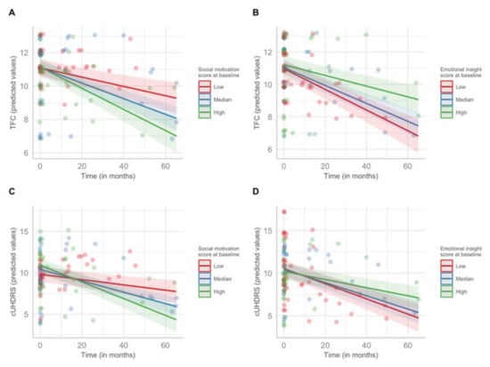 Linear mixed models showed significant interactions between the social motivation score and time on motor, functional, and cognitive changes over time in HD patients (Table 4; Figure 3). Likewise, we observed significant interactions between the emotional insight score and time on functional and cognitive changes over time. Overall, these results suggest that participants with high scores on social motivation and/or low scores on emotional insight at baseline have higher changes over time (rapid disease progression). Cohen’s f2 values revealed small- to medium-effect sizes for the interactions between the social motivation score and time, and small-effect sizes for the interactions between the emotional insight score and time.