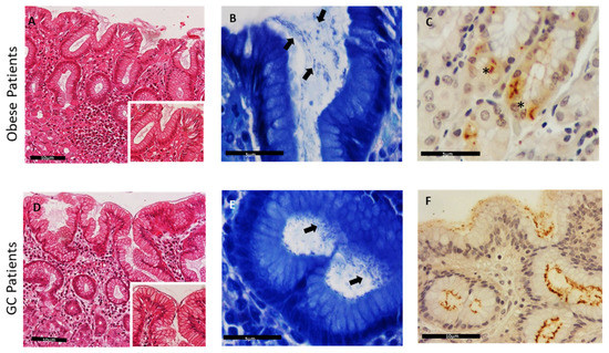 Detection of Helicobacter species in human gastric mucosa sections. H&E stain of gastric sections from obese (OB) patients (A) and gastric cancer (GC) patients (D), 200× and 400× (inset). Modified-Giemsa stain, highlighting bacteria at the epithelium surface and gastric crypts (black arrows), in obese patients (B) and GC patients (E), magnification 600×. (C,F) Helicobacter spp. immunopositivity within the superficial mucus, in the lumen of gastric deep glands, 400×, and inside parietal cells, 600×, (*) in obese patients (C) and GC patients (F).