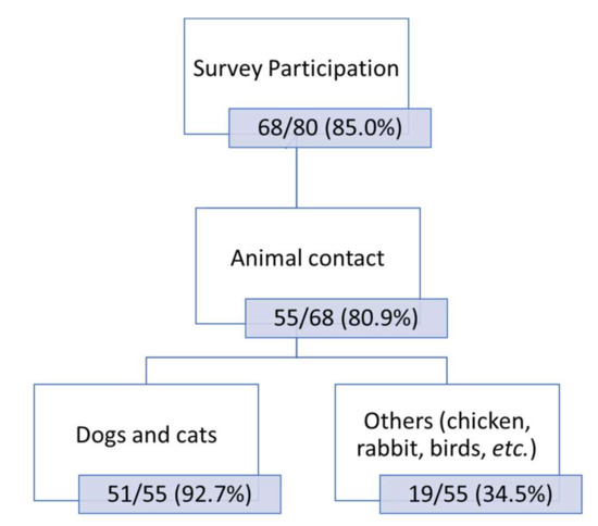 Among the 80 patients included in the study, 68 answered the survey (85.0%), of which 13 belong to the GC group (13 out of 17; 76.5%) and 55 to the OB group (55 out of 63; 87.3%). Close contact with animals was referred to by 55 patients (80.9%), comprising 11 out of 13 GC (84.6%) and 44 out of 55 OB patients (80.0%). The great majority of the respondents classified the contact with pets as a regular and daily basis (51/55; 92.7%). Close contact with dogs and cats was mentioned by 8 out of 11 GC patients (72.7%) and 43 out of 44 OB patients (97.7%). Contact with other animals, such as chickens, rabbits, parakeets, sheep, etc., was also mentioned by 34.5% of the patients, including 6 out of 11 GC (54.5%) and 13 out of 44 OB patients (29.5%).