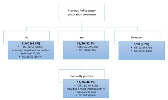 Additionally, limitations of the study have to be taken into account. Different surgical approaches were used to collect the gastric samples according to the type of patients (cancer vs. obese) which may have influenced the results obtained. Addition of a control group would certainly benefit comparisons and statistical analysis. Moreover, with respect to Helicobacter spp. eradication treatment, the results described were due to different therapeutical schemes using different drugs, and part of the information herein obtained was based on the testimony and memory of the patients themselves.