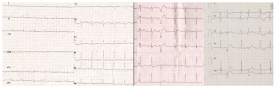 The EKG showed flattened T waves in the limb leads and negative in V5 and V6, ventricular extrasystoles with left bundle branch block (LBBB) and right bundle branch block (RBBB) (Figure 2).