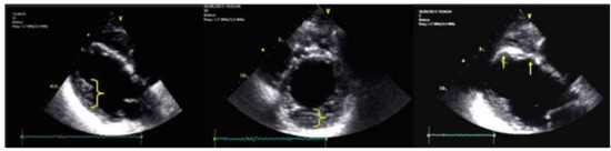Cardiac ultrasound. Left image: long-axis parasternal section shows dilated LV, with hyperechoic thin SIV, and LV noncompaction areas at the posterolateral wall (brace); middle image: short axis parasternal section displays noncompact LV area (brace) > 2 × compact LV area; right image: parasternal section long axis shows aneurysms located at the SIV level (arrows).