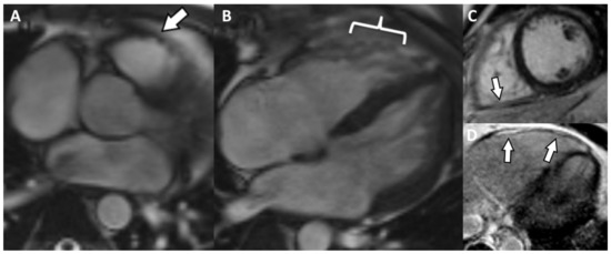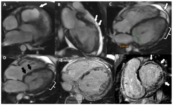 (A) Axial Cine-GRE sequence: focal dyskinesia of the RVOT; (B) Cine-GRE two-chamber LV sequence: focal dyskinesia of the anterior wall of the LV; (C,D) four-chamber Cine-GRE sequence: focal dyskinesia of the RV apex (arrow), dyskinesia of the lateral wall of the LV (square brackets), akinetic IVS areas (black arrows); (E) PSIR sequence—delayed postcontrast axial view: concentric midmyocardial LGE within the LV and diffuse, inhomogeneous LGE of the lateral wall of RV; (F) PSIR sequence—delayed postcontrast short axis view: midmyocardial LGE of the LV base.