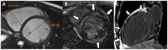 A cardiac MRI showed the following: dilated LV (51/60 mm), non-dilated RV (41 mm short axis) (Figure 6A), global hypokinesia of the LV and RV, more severe at the level of IVS, without dyskinetic areas. The pattern of the LGE revealed inhomogeneous midmyocardial fibrosis of all the walls of the LV in the basal, mid and apical segments, with scattered area of normal parenchyma (Figure 6B,C). The ventricular function is severely altered (LVEF = 23%; RVEF = 25%; EDV/S = 72 mL/m2).