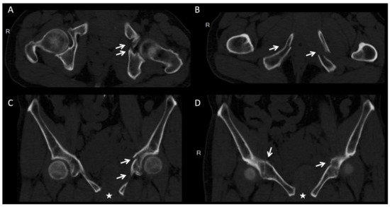 Computed tomography scan images showing bilateral superior and inferior pubic ramus fracture (arrows) combined with diastasis of pubic symphysis (asterisks). (A,B) Axial view and (C,D) coronal view.