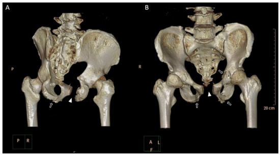 Three-dimensional reconstruction computed tomography scan images showing bilateral superior and inferior pubic ramus fracture (hollow arrows) combined with diastasis of pubic symphysis (triangles) from (A) posterior aspect and (B) anterior aspect.