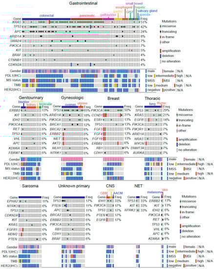 First, we sought to determine the mutational landscape of tumors. Our workflow is depicted in Supplementary Figure S1. Briefly, the entire cohort (n = 202) was analyzed by NGS using gene panels at various platforms. Patient subsets were analyzed by IHC to determine HER2 (n = 126) and PDL1 (n = 128) expression. MSI status and TMB were also analyzed by a combination of NGS/IHC or NGS in patient subsets (n = 124 and n = 117, respectively). Mutational landscapes on analyzed tumors are displayed in Figure 1. As pointed out, gastrointestinal cancers were the most prevalent in our cohort. Among these, KRAS (51%) was the most frequently altered gene, mainly due to colorectal and pancreatic cancers followed by TP53, APC, ARID1A, SMAD4 and PIK3CA. Please note the low number of alterations in gallbladder and hepatic tumors. For genitourinary tumors ERBB2 and KIT were the most commonly altered genes, but the number of alterations in these tumors was generally low. As expected, TP53 was the most frequently altered gene on gynecological tumors, followed by ARID1A and PIK3CA. Similarly, BRCA1 and BRCA2 truncations were found in these tumors. As expected PIK3CA mutations and CCND1 amplifications were also recurrent among breast cancer patients; TP53 was frequently altered in lung cancer patients and in those with unknown primary tumors. On the other hand, sarcomas were characterized by a low number of alterations. Other less prevalent tumor types analyzed included CNS and NETs.