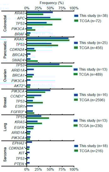 A descriptive comparison of the frequency of molecular alterations between the six main tumor types in our study and matched cohorts of the TCGA was performed. The frequencies were obtained using the bio-portal database [17]. The studies selected for each type of tumor were: colorectal cancer [18], pancreatic cancer [19], sarcoma [20], breast cancer [21,22], ovarian cancer [23], lung cancer [24].