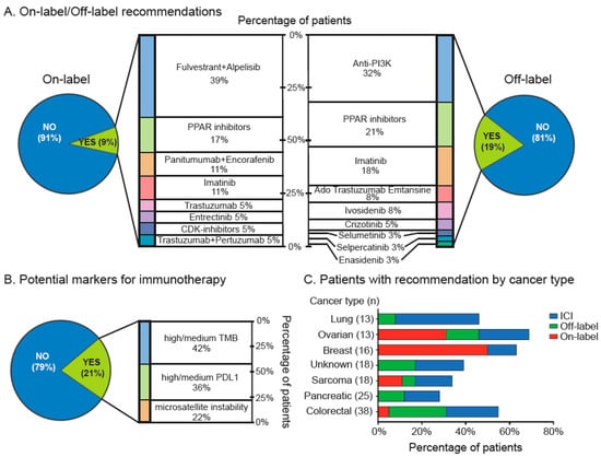Clinical actionability for targeted therapies. (A) On-label (left panel) and off-label (right panel) and (B) immune checkpoint inhibitor recommendations based in NGS/IHC profiles. (C) Percentages of recommendation (on-label, off-label or ICI) by cancer type.