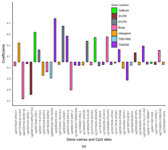 (a): Bar graph showing the main effects of DNAm on asthma acquisition at each of the 38 identified CpGs in the IOWBC in males. Gene names corresponding to each CpG site are also labelled on the X-axis. (b): Bar graph showing the main effects of DNAm on asthma acquisition at each of the 52 identified CpGs in the IOWBC in females. Gene names corresponding to each CpG site are also labelled on the X-axis.