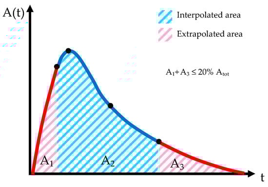 Constant, linear, or analytical fit are usually proposed for the extrapolation of the time–activity curve before the first experimental timepoint, whereas analytical or physical decay are options for extrapolating the curve after the last timepoint (Figure 2). Appropriate extrapolation of the curve in order to obtain the time-integrated activity (TIA) is crucial for dosimetry accuracy []. In order to avoid possible significant errors, therefore, the European Association of Nuclear Medicine (EANM) guidelines recommend that the fractional contribution of the TIA from the extrapolations should be less than 20% [].