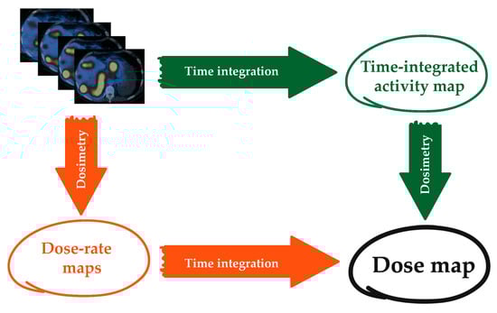 As an alternative to the activity integration, time integration of the dose rate could be also performed. In this case, activity maps at each time point are converted into dose-rate maps using one of the methods described above and absorbed dose is obtained by integrating the dose rate (Figure 4).