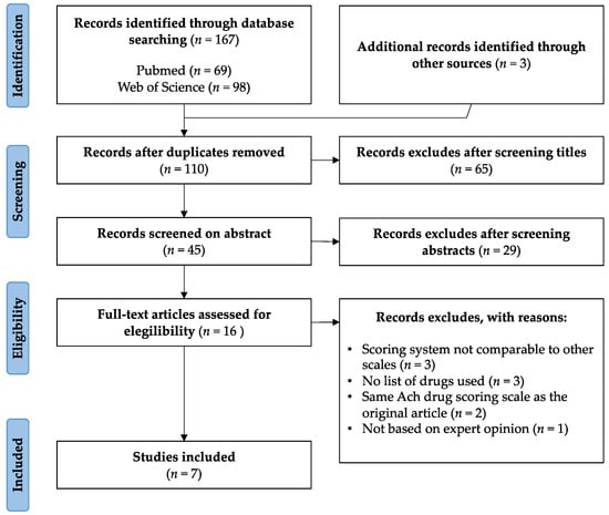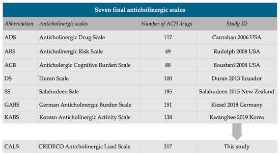 - Lisibach, A.; Benelli, V.; Ceppi, M.G.; Waldner-Knogler, K.; Csajka, C.; Lutters, M. Quality of anticholinergic burden scales and their impact on clinical outcomes: A systematic review. Eur. J. Clin. Pharmacol. 2021, 77, 147–162. [Google Scholar] [CrossRef] [PubMed]