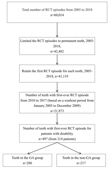 Participants included a total of 60,014 outpatient claims of RCT for patients with disability at Kaohsiung Medical University Chung-Ho Memorial Hospital between January 2005 and December 2018. We retained 21,873 first-visit RCT records of permanent teeth from January 2010 to December 2017 based on a washout period from January 2005 to December 2009; and kept at least one year for follow up after RCT. This study finally enrolled 280 teeth from 108 patients who received GA for RCT, and 217 teeth from 106 patients without GA from RCT. The flow chart of sample enrollment is shown in Figure 1.
