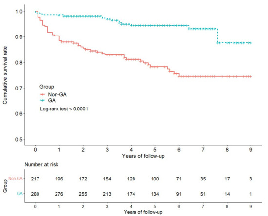 Comparison of 9-year cumulative survival rate of teeth receiving root canal treatment with and without general anesthesia. GA, general anesthesia; non-GA, not general anesthesia.
