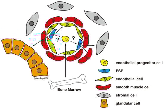 ESP cells share many properties with endothelial progenitor cells. Those cells may originate from the bone marrow. Whereas ESP cells are present in the eutopic endometrium, it is likely that the origin of endometrial stem/progenitor cells may be the bone marrow as illustrated in Figure 4. ER-β is not a stem cell marker but it is expressed abundantly in endometriotic lesions []. Because ESP selectively express ABCG2 and ER-β [], it is highly likely that ESP cells are a candidate for endometriosis-initiating cells.