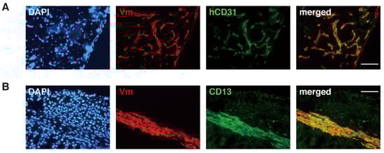Expression of endothelial and stromal cell markers (hCD31 and CD13, respectively) in human-derived cells present around an ESP-initiated lesion. Immunofluorescence images of the ESP-initiated lesion in immunodeficient mouse kidney co-stained with DAPI and antibodies against only human vimentin (Vm) and hCD31 (A) or antibodies against Vm and CD13 (B). Bars, 100 µm. Reproduced from [] under a CC BY license, with permission from PLOS ONE, original copyright 2010.