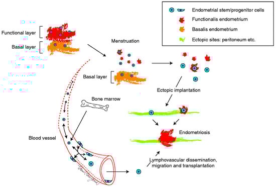 Most of the current theories have been based on the assumption that endometriotic cells originate from the eutopic endometrium. However, other theories are suggested by new advances in endometrial physiology. For example, over the past two decades, endometrial stem cell physiology has been extensively explored through identification, isolation, and characterization of endometrial stem/progenitor cells and clarification of their roles in endometrial structure and function [,,,,,]. These advancements led to the initial stem cell theory for the pathogenesis of endometriosis [,,,], providing new insights that explain the pathogenesis of almost all types of endometrioses in combination with retrograde menstruation- and lymphovascular metastasis-driven implantation theories [].
