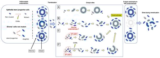 The presence of both driver and passenger mutations in epithelial and stromal cells is rare [,,,,,,]. Consequently, single or low numbers of endometrial stem/progenitor cells with these mutations do not give rise to both epithelial and stromal cells in endometriotic lesions and endometrium. However, it is possible that a stem/progenitor cell population such as ESP cells might be capable of generating endometrial epithelial, stromal, endothelial, and smooth muscle cells [,,,,]. In addition, putative endometrial stem cells without mutations could translocate into ectopic sites and give rise to both epithelial, stromal, and other types of endometriotic lesion cells, as illustrated in Figure 5 (pattern C’). Subsequently, driver and passenger mutations could occur in the epithelium of the newly established endometriotic lesions (pattern C’) in a similar way to the epithelium of the eutopic endometrium [,,]. Because the microenvironments of ectopic sites are generally unsuitable, only epithelial stem/progenitor cells with driver mutations, i.e., CAMs, could survive, i.e., undergo clonal selection and thereafter expand in assistance with supporting stromal cells harboring no or few mutations. In contrast, epithelial stem/progenitor cells and/or glands without CAMs could not survive.