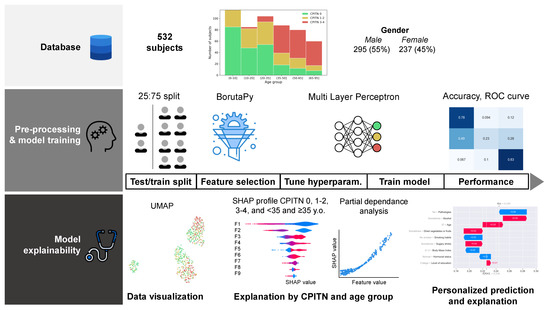 The machine learning pipeline (Figure 1) involved: (1) encoding binary and ordinal variables followed by a feature selection step, (2) a random training/test dataset splitting of 75:25, (3) a min–max data scaler followed by a multilayer perceptron model [16], and (4) explainability of the prediction results on the whole dataset (Figure 1). The scikit-learn library v0.24.0 was used as a general framework [17]. BorutaPy v0.3 [18] is a feature selection method able to select a minimal set of features (i.e., variables) that carry significant information for the prediction model. The following hyperparameters were used: 500 estimators, maximal depth of 3, and entropy as a criterion. The profiles of the subjects, with respect to the variables selected by BorutaPy, were visualized by projecting them through UMAP (i.e., uniform manifold approximation and projection [19]), followed by a DBSCAN algorithm using Euclidean distance to identify clusters of subjects. Descriptive statistics were then produced to characterize each cluster.