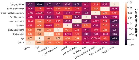 BorutaPy is a feature selection algorithm designed to select only the relevant variables according to the CPITN group score, thus maintaining a minimum number of explanatory variables to establish the final model. By using the BorutaPy algorithm introduced in Section 2.3, 9 out of 30 (30%) variables were retained, namely age, body mass index (BMI), systemic pathologies, educational level, hormonal status, as well as smoking and nutritional habits, such as consumption of dried vegetables or fruits, sugary drinks, and alcohol. Interestingly, gender, stress, oral hygiene practices, and dental attendance were not sufficiently contributive to be selected by the method. The raw correlation matrix showed that age, BMI, and systemic pathologies were highly positively associated to CPITN, while sugary drink consumption was highly negatively associated to CPITN (Figure 2). Smoking habits and hormonal status did not associate with CPITN, although the BorutaPy algorithm showed that they were needed to predict CPITN. Moreover, many parameters were associated with each other, illustrating the complex interactions between the factors themselves, such as pathologies and smoking habits (r = −0.29) or alcohol and smoking habits (r = 0.34). Building a machine learning model will thus make it possible to capture the complex relationships between the variables.