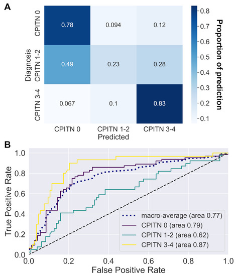 Figure 3. Machine learning model performance. Assessment of the best performing model based on variable selection (BorutaPy), data augmentation, and multilayer perceptron. (A) The corresponding confusion matrix indicates the proportion of good predictions for each category of CPITN. The complexity of predicting CPITN 1–2 is, thus, highlighted. (B) The ROC curves show the relationship between the true positive rate (sensitivity) and the false positive rate (1 - specificity) for each CPITN category.