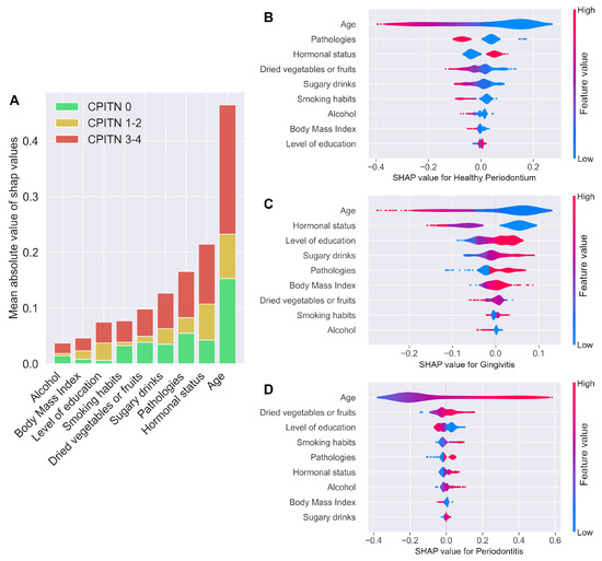 The “kernelSHAP method” was used to interpret the predictions, assigning each attribute (i.e., each variable of the final ML model) with an importance value (SHAP value) for a given CPITN score prediction (Figure 4A–D). Age, systemic pathologies (mostly cardiovascular, endocrine, and metabolic diseases), hormonal status, dried vegetable or fruit consumption, and sugary drink consumption were the five most contributive variables used to predict periodontal health, in contrast to body mass index for example (Figure 4A,B). Increased age, dried vegetable or fruit consumption, smoking, and pathologies tended to increase the risk of periodontitis (CPITN 3–4), in contrast to other variables, such as level of education (Figure 4D). Figure 4C shows that age, hormonal status (for women), level of education, sugary drink consumption and pathology tend to increase the risk of gingival inflammation.