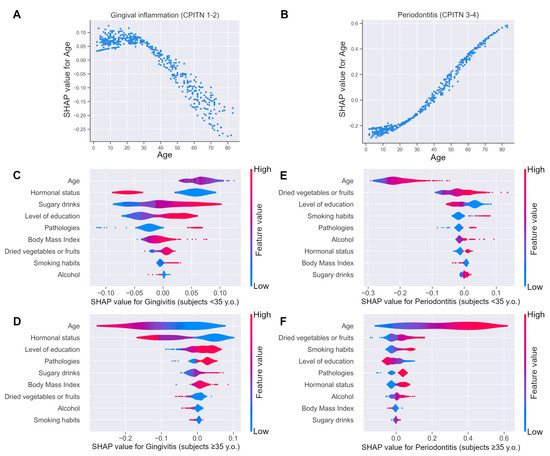 Figure 5. SHAP contribution for CPITN prediction according to the pivotal age of 35 years. (A,B) The partial dependence plots show how the SHAP values partially depend on the input variables of interest. (A) Rise of gingival inflammation risk until 35 years old and decrease thereafter. (B) Sigmoid-type relationship of periodontitis risk with age with a sharp transition around 35 years old. (CF) SHAP values of gingival inflammation (C,D) or periodontitis (E,F) risk according to feature values for subjects < 35 years old (C,E), and subjects > 35 years old (D,F). The color of each violin plot encodes the value of the associated variable, red for higher values of the variable and blue for lower values. For the categorical variables, a low value can also signify a missing value. For hormonal status, the values are in increasing order as follows: being a man or a girl (<12 years old), non-menopausal woman, postmenopausal woman. On the x–axis, a positive SHAP value signifies that the variable contributes positively to the risk prediction, whereas a negative SHAP value signifies that the variable negatively contributes to the prediction. Variables are shown from the top to the bottom in order of importance (mean of absolute SHAP values).