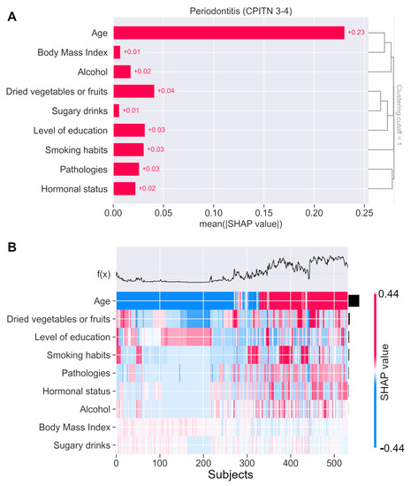 Figure 6. SHAP values correlation and clustering on periodontitis prediction. (A) SHAP bar plot clustering (right side) displays the redundancy structure as a dendrogram. Age mainly correlates with BMI and alcohol consumption, while pathologies are strongly associated with hormonal status. Diet seems to be rather dependent on the level of education. (B) The SHAP values clustering on the whole population highlights the different risk factor combinations that may explain the prediction of a periodontitis diagnosis. f(x) is the predicted probability of periodontitis. Each variable’s SHAP contribution on periodontitis prediction is represented in color by subject.
