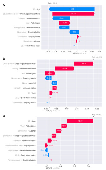 Figure 7. Explanations at the individual level (individual risk prediction). (A) A 28-year-old healthy subject predicted to have a 0.24 probability of periodontitis. (B) A 37-year-old healthy subject with a 0.53 probability of periodontitis. (C) A 49-year-old subject presenting periodontitis-accumulating risk factors and predicted to have a high risk of periodontitis (0.64).