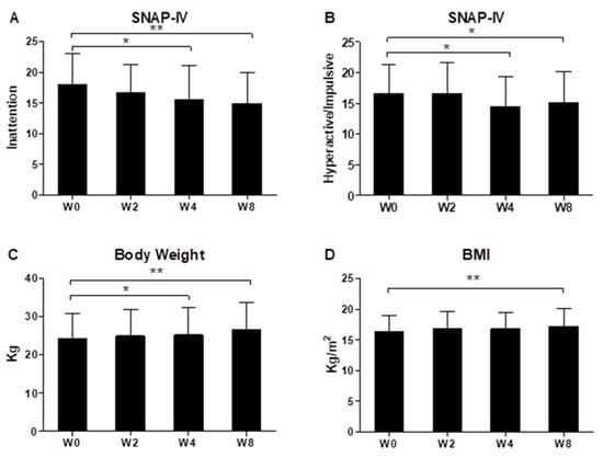 ADHD inattention symptoms (A), hyperactivity/impulsive symptoms (B), patients’ body weight (C) and BMI (D) during the eight-week period of ADHD patients receiving oral probiotic supplements (Bifidobacterium bifidum, Bf-688). * p < 0.05, ** p < 0.01.