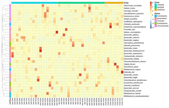 Figure 4 illustrates the bacterial taxonomic distributions of phylum levels in ADHD patients along with time. The most abundant families are Bacteroidota, Firmicutes, and Proteobacteria, respectively. Figure S2 shows the bacterial taxonomic distributions at the species level in ADHD patients at baseline, week 8, and week 12. Bacteroides vulgatus, Bacteroides steroids, Bacteroides uniformis, Bacteroides fragilis, and Shigella flexneri were the five most abundant species among patients.