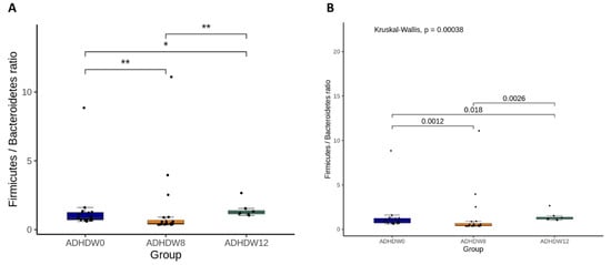 The Firmicutes to Bacteroidetes ratio (F/B ratio) at baseline, week 8, and week 12. Statistical analyses used analysis of variance (ANOVA) (A) and the Kruskal–Wallis test (B). * p < 0.05, ** p < 0.01.