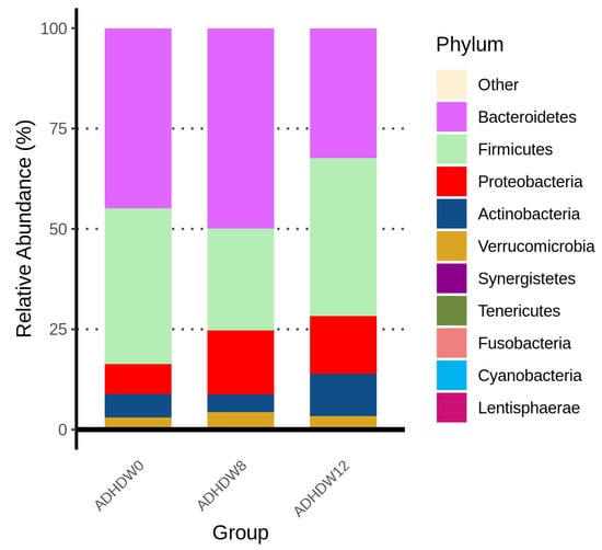 Abundance of the most prevalent bacteria at the phylum level in the fecal samples of ADHD patients at baseline, week 8, and week 12.