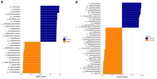 Flora with significant differences between baseline and the 8th week (A) and between baseline and the 12th week (B). The orange bars represent flora with higher abundances after taking probiotics (week 8). The blue bars show flora with higher expressions at the baseline.