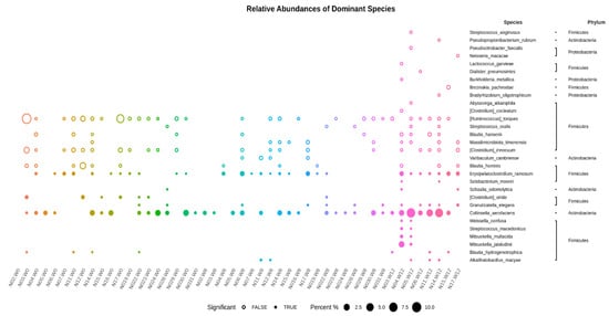 The dominant species and species abundances of each sample shown with those having abundances greater than 1% of the species (ASVs) appearing in at least one sample. The p-values between the two-group statistics (Wilcoxon rank-sum test) or the multi-group statistics (Kruskal–Wallis test). The values are sorted from small to large, and the top 30 dominant species with differences between groups are selected for the circle chart. A solid circle indicates the statistical threshold reached (p < 0.05), and a hollow circle represents a species under the statistical threshold.