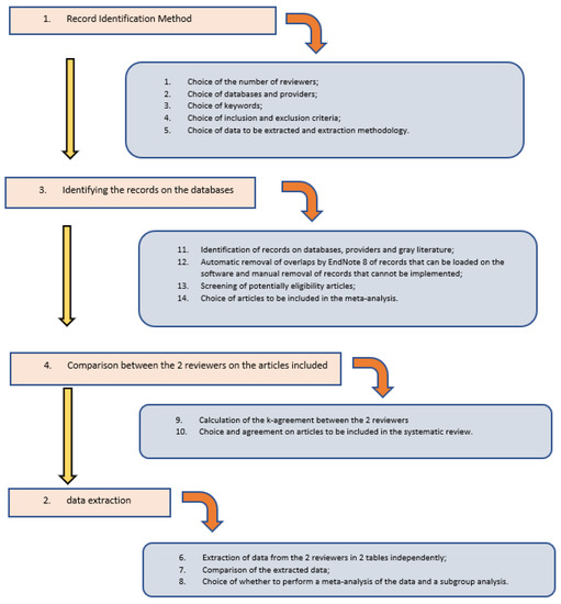 The second phase involved identifying the records on the databases (duplicate results were removed using the EndNote 9 software, the overlaps of studies that could not be uploaded to EndNote were manually removed after the screening phase). Screening of potentially suitable articles (through the analysis of the title and abstract) and the choice of articles to be included in the meta-analysis.