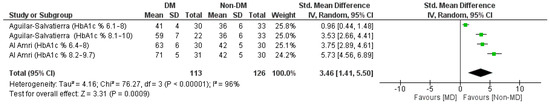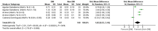 Sensitivity analysis. Forest plot of the random effects model of the secondary outcome meta-analysis, exclusion of Aguilar-Salvatierra (HbA1c% range: 8.1–10), and Cabrera-Domínguez (HbA1c% range: 6.64 ± 0.85).