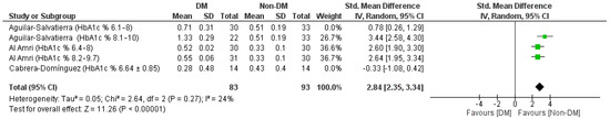 All the seven included studies were prospective clinical studies whose results were published between 2014 and 2021 and featured a maximum three-year follow-up period. The total number of patients with diabetes (DM) recruited for the included studies was 280, and 166 for the control group (Non-DM-patients without diabetes), with a maximum mean age for the study of Tatarakis et al. (2014) [