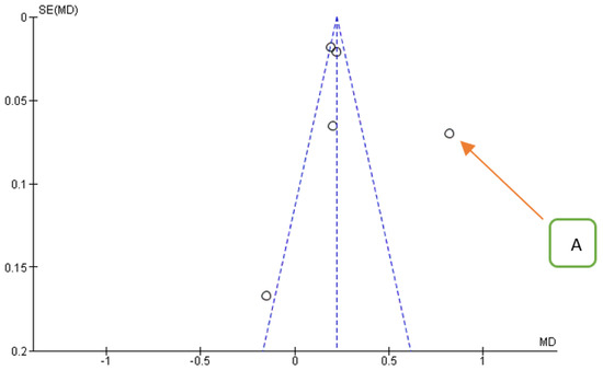 Funnel plot for the secondary outcome, I2 = 94%. The presence of heterogeneity is highlighted graphically. The arrow indicates that the data of Aguilar-Salvatierra (HbA1c% range: 8.1–10) is the likely source of heterogeneity.