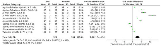 32] (2019) Non-DM group 43.4 (33–49). The total number of implants placed in the DM groups was 343 while for the Non-DM group it was 212. The studies that report data for a follow-up period of only six months were three: Aguilar-Salvatierra et al., 2016 [