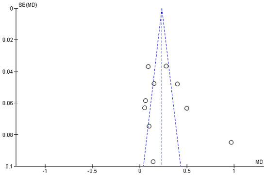 | 12 | observational studies | not serious (a) | Serious (b) | not serious | not serious | all plausible residual confounding would suggest spurious effect, while no effect was observed | 365 | 369 | - | MD 0.12 higher (0.1 higher to 0.14 higher) | ⨁⨁◯◯ Low | IMPORTANT |