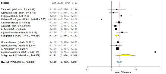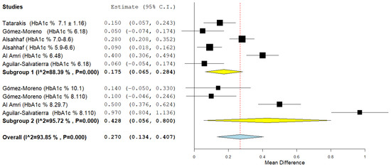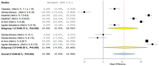 Forest plot of the subgroup analysis for the primary outcome (MBL at 12 months). Subgroup 1 (HbA1c% range: 6–8%); Subgroup 2 (HbA1c% < 8%). The results of the meta-analysis for each subgroup are highlighted in bold. Yellow rhombuses in the forest plot indicate the average effect for each subgroup investigated, the red line shows the position of the average value and the rhombus in light blue shows the measure of the average effect.