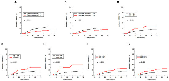The Kaplan–Meier analysis revealed that patients with high values of tumor-rib distance (11.5%) and postoperative chest wall thickness (14.0%) had a significantly lower five-year cumulative incidence of RIRF than those with low values of tumor-rib distance (25.2%; p < 0.001) and postoperative chest wall thickness (21.2%; p = 0.031) (Figure 2A,B). Additionally, patients with high values of V20, V30, V40, V45, and V50 showed a significantly higher five-year cumulative incidence of RIRF than those with low values (28.8% vs. 14.9%, p < 0.001 for V20; 30.6% vs. 15.6%, p < 0.001 for V30, 39.5% vs. 15.7%, p < 0.001 for V40; 25.2% vs. 14.6%, p = 0.010 for V45; 23.8% vs. 13.6%, p = 0.003 for V50; Figure 2C–G).