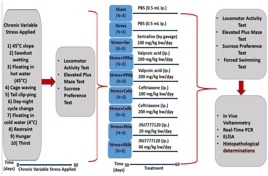 The experimental groups were randomly divided into nine groups with eight animals in each group as follows: Control, Stressed (Stress), Sertraline 100 mg/kg (Ser) (gavage), Valproic acid 100 (VPAa) and 200 mg/kg (VPAb), Ceftriaxone 100 (Cefa) and 200 mg/kg (Cefb), JNJ7777120 20 (JNJa) and 40 mg/kg (JNJb) (i.p) (Figure 1).